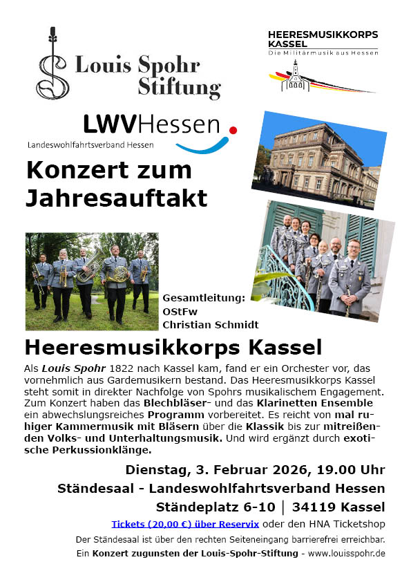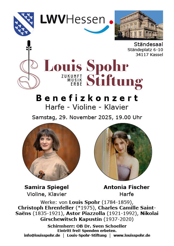 Am Samstag, den 29. November 2025, lädt die Louis-Spohr-Stiftung zu einem Benefizkonzert in den Ständesaal des LWV Hessen, Ständeplatz 6–10, 34117 Kassel, ein. Beginn ist um 19:00 Uhr (Einlass ab 18:30 Uhr).